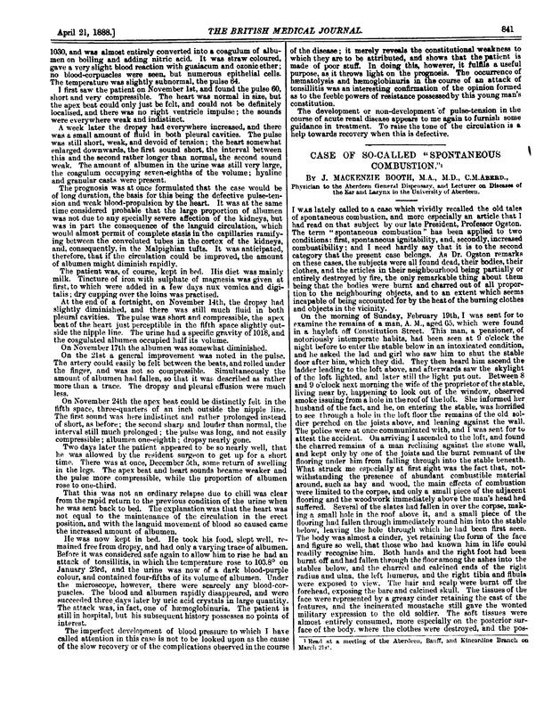 This was reported in the April 21, 1888 edition of the The British Medical Journal and from what I understand is a prestigious publication. I searched the archives and found the actual pdf of the original scanned article. It's titled, Case of So-Called "Spontaneous Combustion", but it's only a part of the full article. It cost $60.00 (£50) to look at the whole thing for one day, and maybe someday when I win the lottery I'll be able to afford it, but unfortunately, I don't gamble.